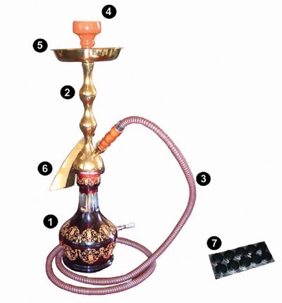 - Base(1) : peça central do narguile; assemelha-se a um vaso. É onde se coloca a água. Geralmente é feita de vidro, metal ou cerâmica; algumas são ornamentadas com desenhos.
